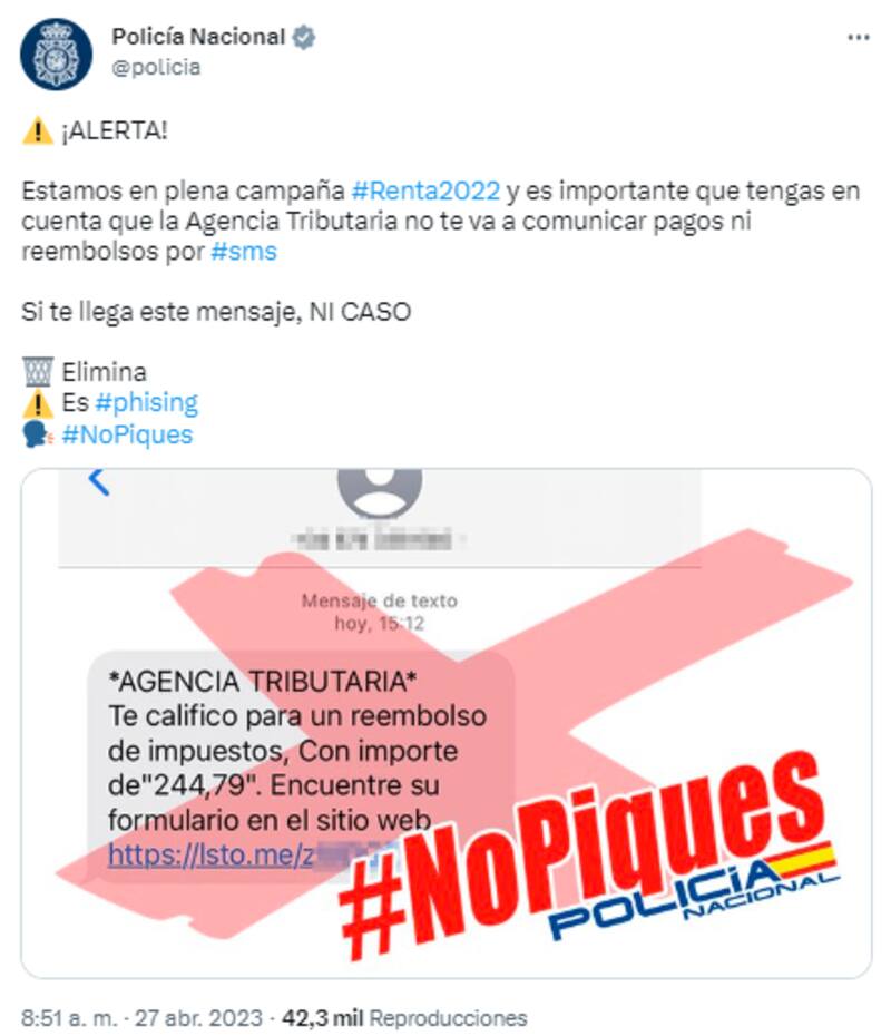"Estamos en plena campaña Renta2022 y es importante que tengas en cuenta que la Agencia Tributaria no te va a comunicar pagos ni reembolsos por sms. Si te llega este mensaje, NI CASO", indica el organismo policial.