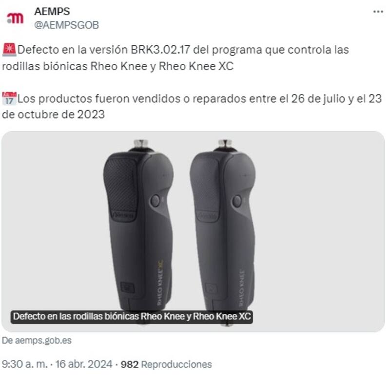 Mediante una alerta sanitaria realizada por la Agencia Española de Medicamentos y Productos Sanitarios (AEMPS), las autoridades han informado de un defecto en el firmware de las rodillas biónicas Rheo.