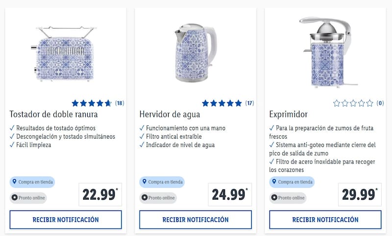 La colección de Lidl consta de una tostadora, un hervidor y un exprimidor con mosaicos azules típicos del estilo mediterráneo. Aunque no son copias exactas, mantienen la esencia visual de los originales.