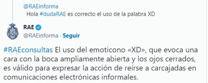 La respuesta por parte de la RAE no se hizo esperar y en otro posteo confirmó que el uso de esa expresión es correcta, aunque solamente en ciertos casos. "El uso del emoticono 'XD', que evoca una cara con la boca ampliamente abierta y los ojos cerrados, es válido para expresar la acción de reírse a carcajadas en comunicaciones electrónicas informales", sostuvo.