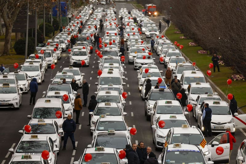 En Madrid, unos 3000 taxistas procedentes de toda España han acudido a la convocatoria de la asociación Antaxi y se han concentrado ante la sede del Ministerio de Transportes, en el Paseo de la Castellana, en una marcha lenta pacífica y festiva, que se ha desplazado unos cientos de metros más al norte, hasta el Ministerio de Economía.
