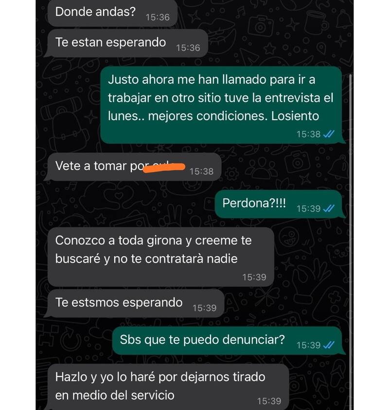Fuera de sí, el encargado aseguró conocer a "toda Girona", la ciudad donde se encontraban los dos establecimientos. "Créeme, te buscaré y no te contratará nadie", amenazó. "Te estamos esperando", insistió.