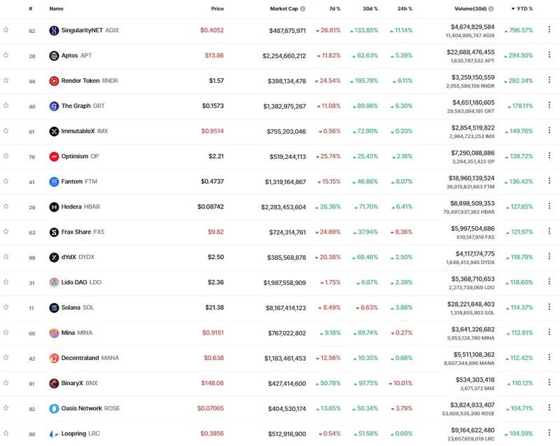 Además de AGIX, la lista incluye también a The Graph (GRT), moneda correspondiente a una plataforma de big data que se apreció 178% en lo que va del año.