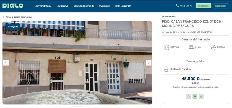 Esta vivienda con terraza, ubicada cerca del centro histórico de Molina de Segura, en Murcia, está disponible por 45.500 euros a través de Santander. El piso se encuentra en la tercera planta de un edificio residencial con portero automático y se distribuye en un luminoso salón-comedor, una cocina independiente, tres amplios dormitorios con ventanas y un baño.