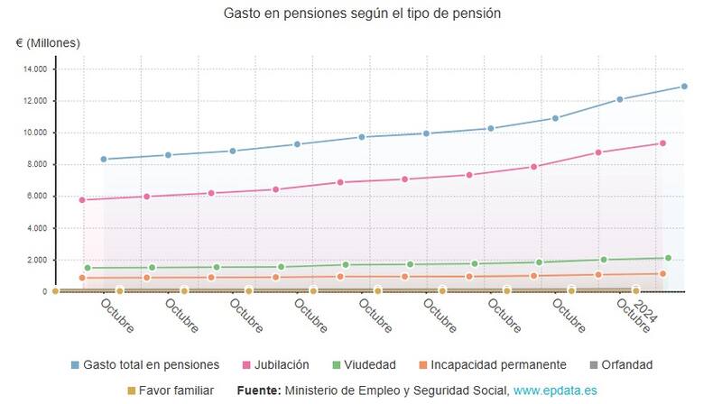 El gasto total de pensiones en España fue de 12.895,77 millones de euros en octubre de 2024, lo que supone un aumento del 6,79% con respecto al mismo mes del año pasado.