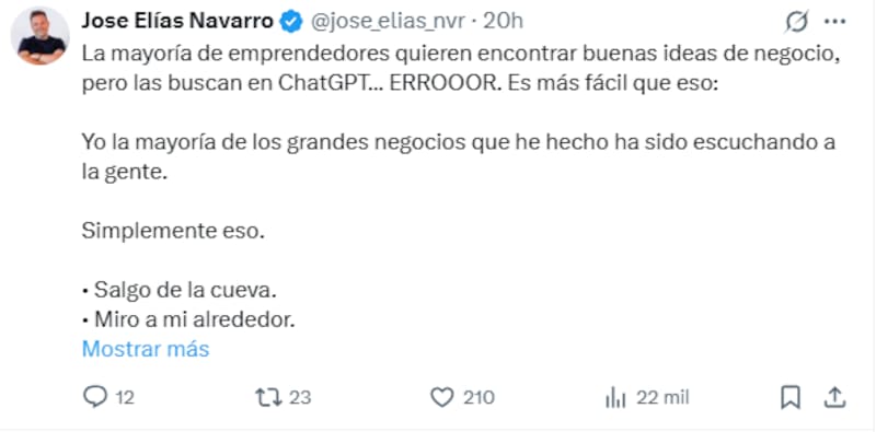 "La mayoría de emprendedores quieren encontrar buenas ideas de negocio, pero las buscan en ChatGPT... error", escribió el empresario en su publicación.