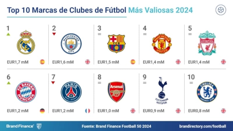 Seis de estos clubes figuran en el top 10, con el Manchester City FC en el segundo puesto (1600 millones) y el Manchester United FC (hasta 1400 millones) y el Liverpool FC (1400 millones) manteniendo las posiciones cuarto y quinto respectivamente. El Arsenal FC, el Tottenham Hotspur FC y el Chelsea FC mantienen los puestos octavo, noveno y décimo respectivamente.