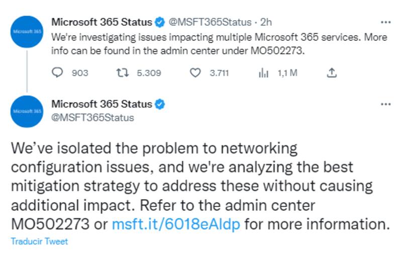 Si bien la tecnológica ha reconocido estos contratiempos, aún no ha precisado qué mercados han sido afectados ni cuántas personas permanecen afectadas por este problema. La cuenta de soporte de Microsoft 365 ha emitido un tuit en el que indica: "Hemos identificado un posible problema de red y estamos revisando la telemetría para determinar los próximos pasos de solución de problemas".
