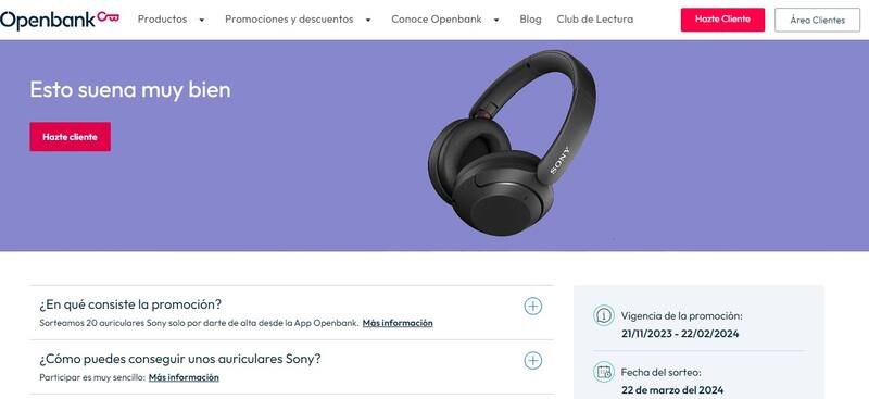 Openbank, la banca 100% digital del Grupo Santander, ha anunciado un nuevo sorteo que sorprende una vez más a todos sus clientes. Se trata de la posibilidad de obtener unos auriculares Sony por cumplir con un único requisito.