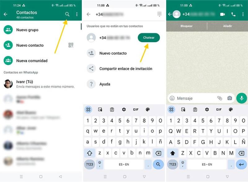 En los resultados de búsqueda aparecerá el usuario que no está entre los contactos de tu agenda y dos opciones: nuevo contacto o chatear, esta opción abrirá directamente un chat a el número con el que queramos hablar sin la necesidad de ningún otro truco.