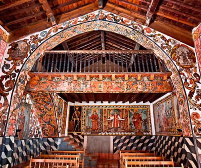 Construida en el siglo XVIII, la ermita conserva un ciclo pictórico único, realizado entre 1734 y 1735, que cubre todos sus rincones. Retablos, cortinas y arquitecturas ilusorias se despliegan en un estilo ingenuo y colorista, propio del arte popular de la época.