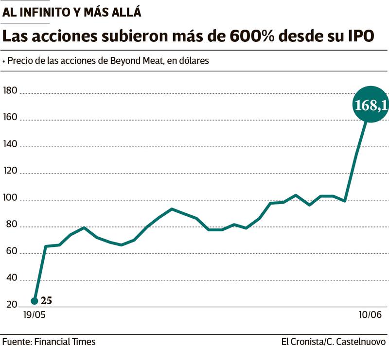 El alza de ayer se produjo después de que Beyond Meat la semana pasada informó que los ingresos netos van camino a aumentar más de 140% interanual a u$s 210 millones en 2019, cifra superior a las estimaciones de los analistas.