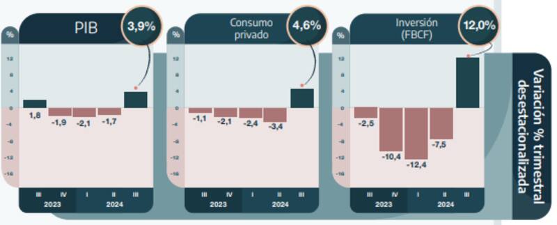 El PIB se expandió un 3,9 por ciento de julio a septiembre en términos ajustados estacionalmente en comparación con el trimestre anterior, lo que marca el primer trimestre de crecimiento de Argentina desde que entró en recesión a fines de 2023, dijo el lunes la agencia de estadísticas del país.