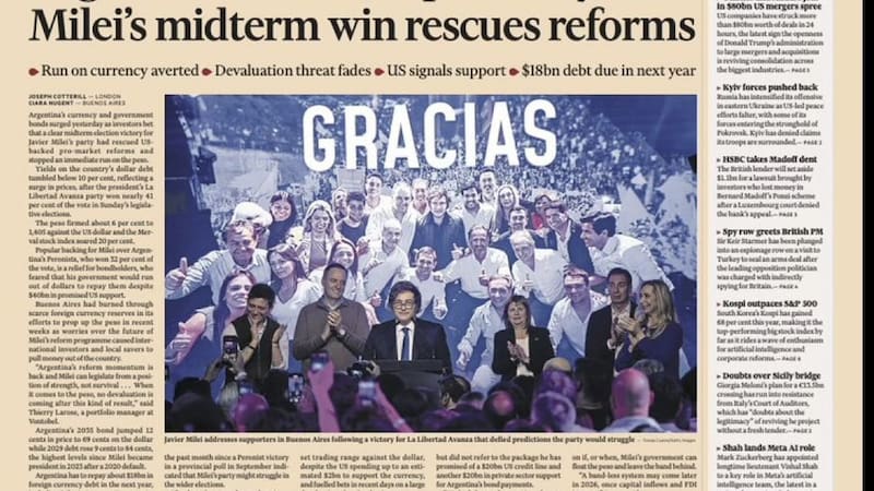 Los bonos soberanos y el peso argentino se recuperaron con fuerza luego del triunfo de La Libertad Avanza en las elecciones de medio término del domingo 26 de octubre, según un análisis publicado por el diario británico Financial Times. El artículo, firmado por Joseph Cotterill desde Londres y Ciara Hugent desde Buenos Aires, sostuvo que el resultado electoral "rescató las reformas promercado respaldadas por EE.UU." y disipó el temor a una devaluación inmediata.