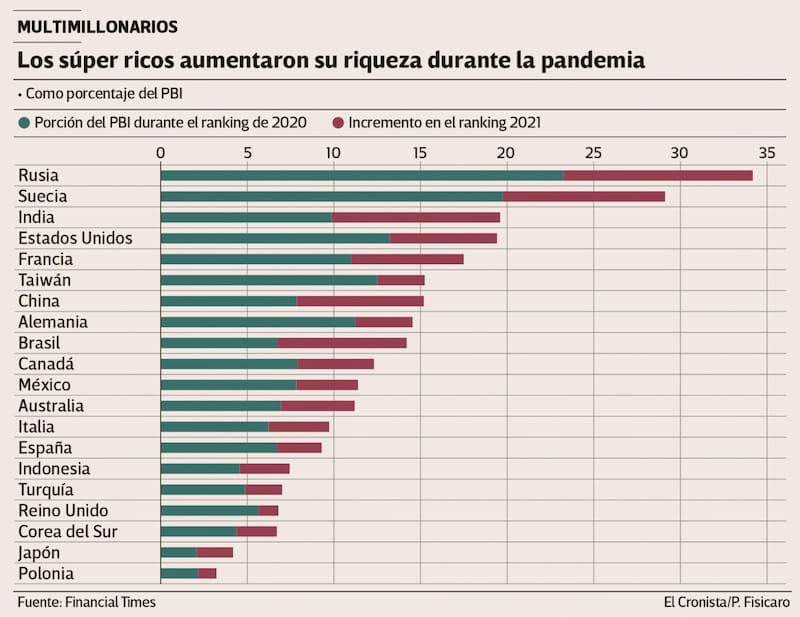 Una tendencia similar se está produciendo en Francia, que tradicionalmente es de izquierda, donde la riqueza de los multimillonarios había aumentado a 11% del PBI cuando empezó la pandemia, y saltó a 17% el año pasado.