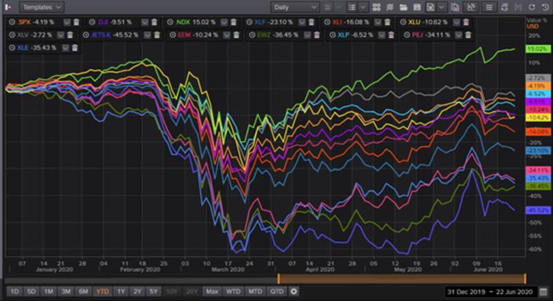 Se cumplen tres meses de que el mercado alcanzó un piso el 23 de marzo pasado, en pleno escenario de pánico por la crisis del coronavirusy su impacto económico a nivel global. Desde entonces, el mercado americano subió 38% en promedio, con sectores que avanzaron mas y otros que avanzaron menos. Sin embargo, si se lo toma desde comienzo de año, la foto muestra que hay sectores que quedaron más golpeados que otros, con las tecnologías como grandes ganadores de la actual crisis.