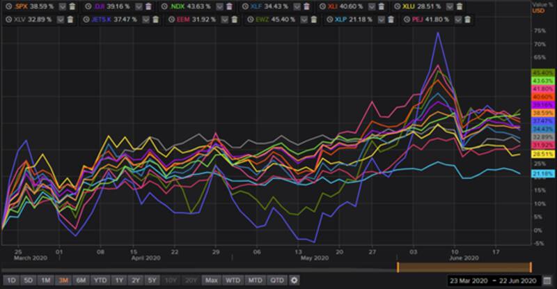 Desde el 23 de marzo a la fecha, el S&P500 sube un 38,5% mientras que el Dow Jones subió un 39%. El tecnológico Nasdaq subió un 43,4%. Hay sectores que tuvieron una mejor performance que los índices de referencia y hay sectores que se comportaron peor. Por ejemplo, el sector industrial de EEUU subió un 40% mientras que el de entretenimientos avanzó un 42%.