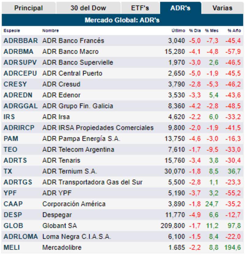 Las acciones argentinas que operan en Wall Street caían hasta 5% en un mal día para los mercados del mundo, golpeados por la noticia de una nueva cepa de coronavirus que vuelve a paralizar y poner en jaque las economías del mundo.