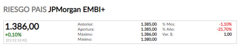 El riesgo país avanzaba apenas una unidad hasta los 1386 puntos. El índice S&P Merval perdía (-2,9%) hasta los 50.822 puntos.