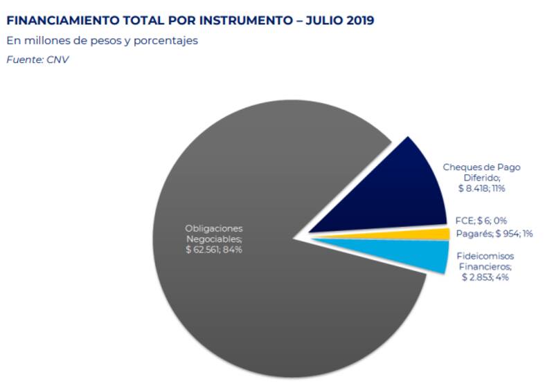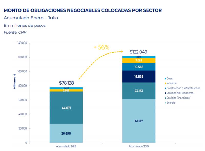 La emisión acumulada de ON durante los primeros siete meses del año 2019 alcanzó los $ 122.049 millones, un 56% superior a los $ 78.128 millones del año previo.