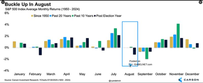 Los meses de agosto y septiembre suelen ser los de peor performance a nivel histórico en Wall Street. Según datos de la consultora internacional, Carson, el retorno en el S&P500 en agosto suele ser nulo desde 1950 a la fecha, así como también en los últimos 20 años.