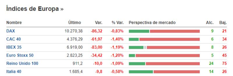 Casi la mitad del índice selectivo español registra pérdidas superiores al 2%, aunque más avanzada la jornada recorta las pérdidas a 1,20%. Todos los bancos, excepto Bankina que baja un 0,8%. Mediaset lidera las caídas con una bajada de más del 4%. Le siguen Ferrovial, Ence y Mapfre que descienden más del 3%. Entre las ganancias destacan Indra y Colonial con subidas por encima del 2%.
