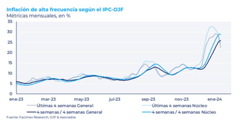 "Con datos al 12 de enero, el IPC-OJF de Ferreres midió para la semana pasada una inflación general del 2,2% semanal y una inflación Núcleo del 3,2% semanal. En la medición punta a punta de los últimos 30 días, el IPC-OJF registró una suba de 22,4% para el nivel general y 24,4% para la Núcleo, desacelerando 6,6pp y 5,8pp con respecto a los datos de la semana pasada, respectivamente", detallaron.