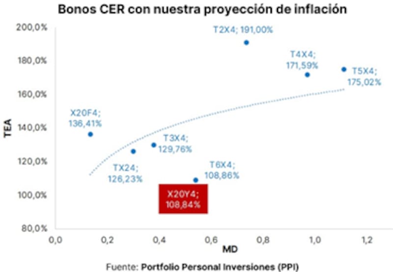 "La semana pasada estuvimos recomendando estirar duration en CER tras el sell off. La estrategia la estamos manteniendo con foco en T4x4, T2X5 y TX26. Vemos los títulos CER de corto plazo con rendimientos muy negativos que pricean inflaciones más elevadas que las estimadas por las consultoras económicas. Por eso preferimos estirar duration en búsqueda de rendimientos más atractivos", dijo Broggi.