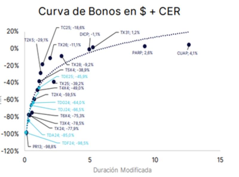 "El flujo de pesos probablemente sostiene valuaciones, producto de la poca oferta de activos, generando spreads muy negativos sobre CER. El tramo largo de la curva, mucho más sensible por duration, podría ser muy volátil, y spreads en esos niveles, pocas veces han sido sostenibles", afirmó Calviello.