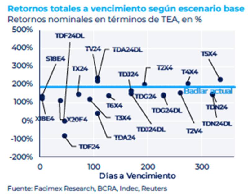 En ese sentido, detallaron que no precisamente luce atractivo comprar bonos a 2026 (TX26) con tasas de CER -10,7%, pero dado los precios actuales, cuesta justificar la compra de bonos a 2024 con tasas efectivas anuales de -63% a -76%.