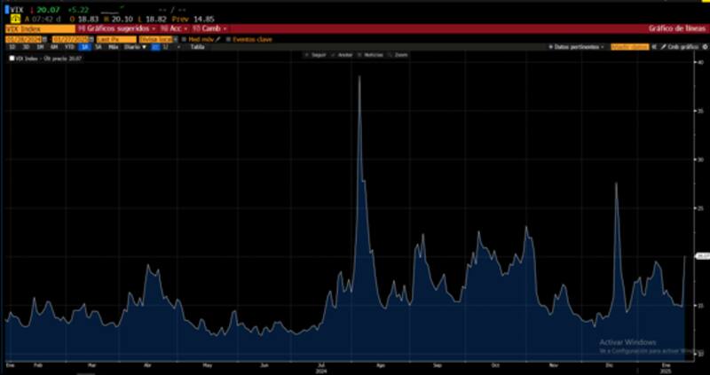 El índice de volatilidad Cboe, conocido como VIX, se dispara 35% a 20 puntos, su mayor valor desde diciembre.