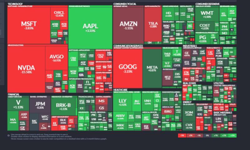 Otras big tech como Google pierden 3,3%, Tesla 2,2%, Amazon opera con una baja de -1,1% y Microsoft baja 3,8%