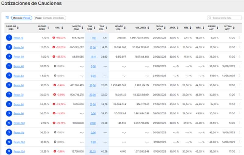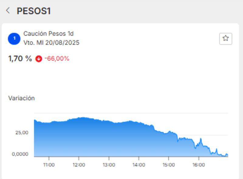 La caución a 1 día cerró el martes en 1,7%, algo similar a lo que había ocurrido el lunes, cuando cerró en 2,1%.