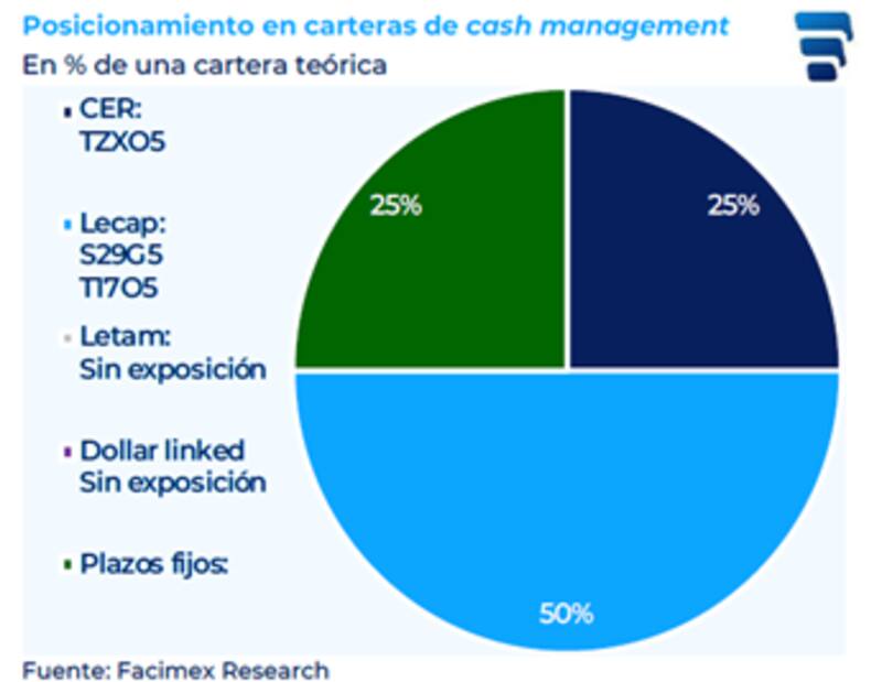 "Concentramos la cartera de cash management en títulos a tasa fija, donde destacamos a la Lecap a fin de septiembre (S29G5) arriba de 4% TEM y el Boncap a octubre (T17O5) en 3,8% TEM. Un 25% lo destinamos al Boncer a octubre (TZXO5) en CER+25% y el 25% restante lo complementamos con plazos fijos, aprovechando que la TAMAR está en máximos", detallaron desde Facimex Valores.