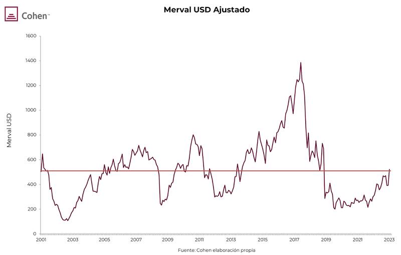 Por su parte, el S&P Merval en pesos marca una baja del 21% desde el mismo periodo. Actualmente vale 1.040.000, cayendo desde sus máximos históricos de 1.316.000.
