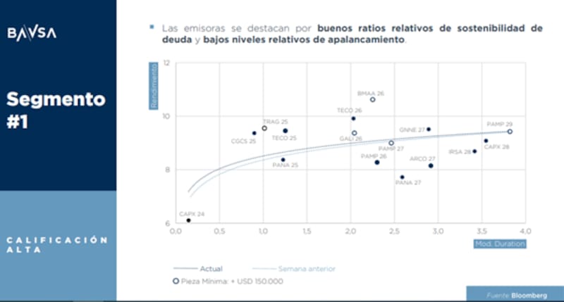 "Nuestra recomendación actual se inclina hacia emisiones de alta calidad crediticia, como son los bonos de TGS con vencimiento en 2025, Pampa a 2027, y YPF garantizado al 2026 y 2031, con tasas internas de retorno (TIR) que consideramos atractivas dadas las circunstancias: 10% para TGS y Pampa, y 9% para YPF", dijo Mazza.