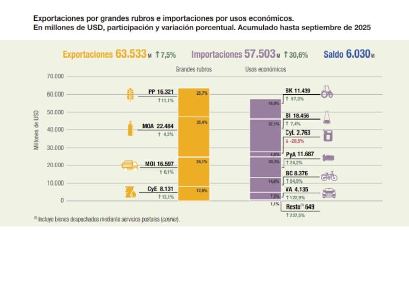 Según el Indec, las importaciones crecieron este año más velozmente que las exportaciones, generando un saldo comercial menor que el registrado en 2024. Entre enero y septiembre, las importaciones treparon 30,6% y totalizaron los u$s 57.503 millones, mientras que las exportaciones aumentaron 7,5% y ascendieron a u$s 63.533 millones. La balanza comercial, en tanto, registró un superávit de u$s 6030 millones.