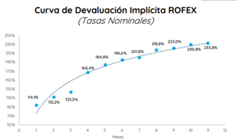 Luego, en el contrato de agosto, la tasa implícita de devaluación esperada en Rofex salta a 168%, para luego acelerar a 184% en septiembre y superar el 200% desde diciembre en adelante.