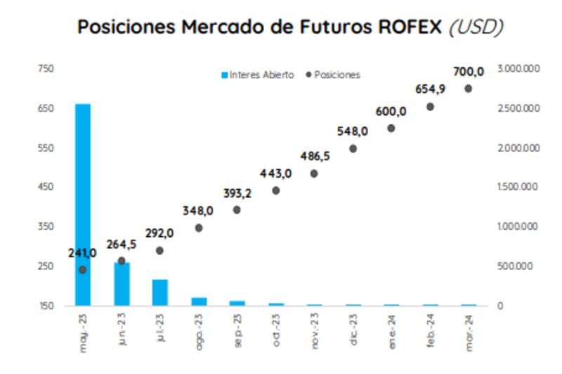 El contrato de Rofex a abril de 2024 opera en niveles de $ 745, lo cual implica un dólar que más que triplica al valor actual.