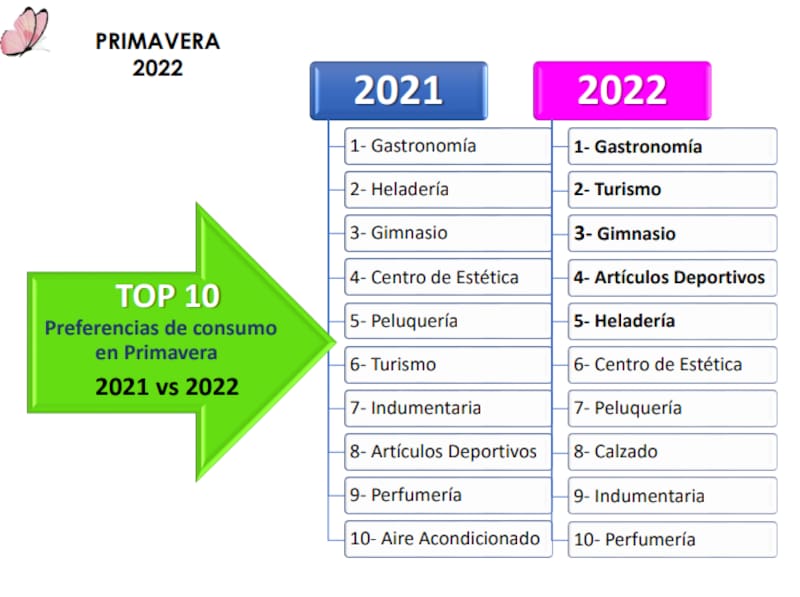 Los resultados de la preferencia de consumos arrojó el listado de rubros favoritos en Primavera, y el top 10 se compone de la siguiente manera: 1-Gastronomía, 2- Turismo, 3- Gimnasio, 4- Artículos Deportivos, 5- Heladería, 6- Centro de Estética, 7- Peluquería, 8- Calzado, 9- Indumentaria, y 10- Perfumería.