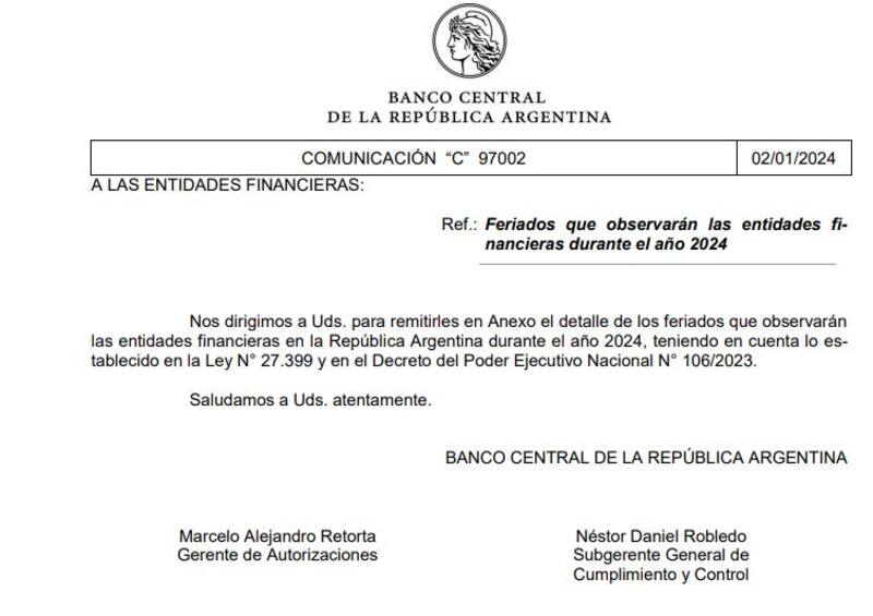 "Nos dirigimos a Uds. para remitirles en Anexo el detalle de los feriados que observarán las entidades financieras en la República Argentina durante el año 2024, teniendo en cuenta lo establecido en la Ley N° 27.399 y en el Decreto del Poder Ejecutivo Nacional N° 106/2023", anuncia el comunicado del BCRA.
