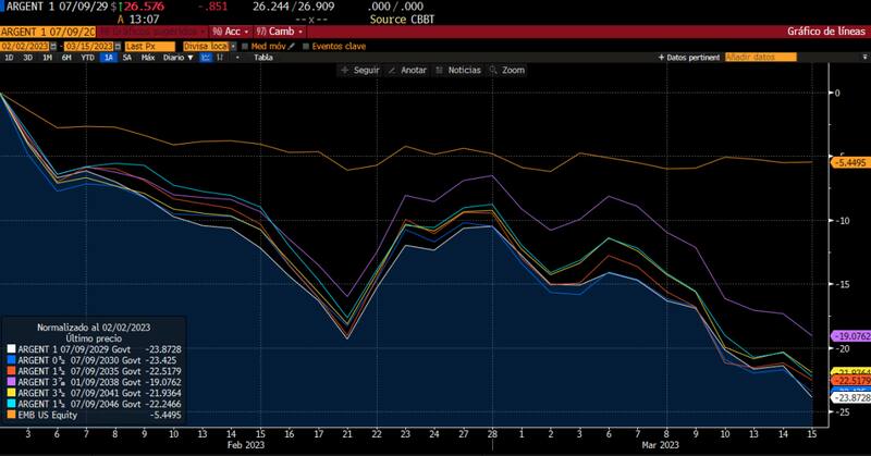 Todos los tramos de la deuda argentina sufrieron un fuerte castigo en las últimas semanas. Desde febrero a la fecha los bonos argentinos muestran una importante caída del 20% en promedio.