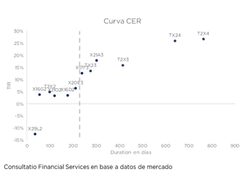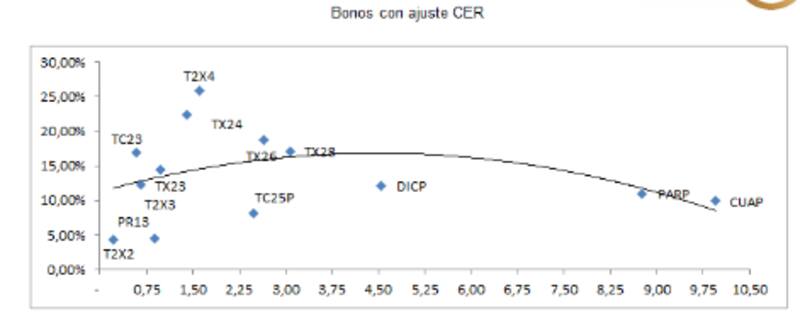 Al cierre del viernes, los bonos que ajustan por CER mostraban rendimientos del 10% al 25% en la mayoría de los tramos, lo cual implica un contexto notable de aversión al riesgo sobre estos activos.