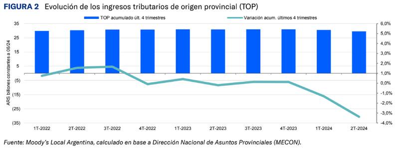 "La recaudación tributaria de las provincias cayó un 5,9% interanual en el primer trimestre del año. Este guarismo representó, en promedio, el 29,7% de los ingresos corrientes (excluyendo ingresos relacionados a contribuciones de la seguridad social) de las provincias calificadas por Moody's", agregó.