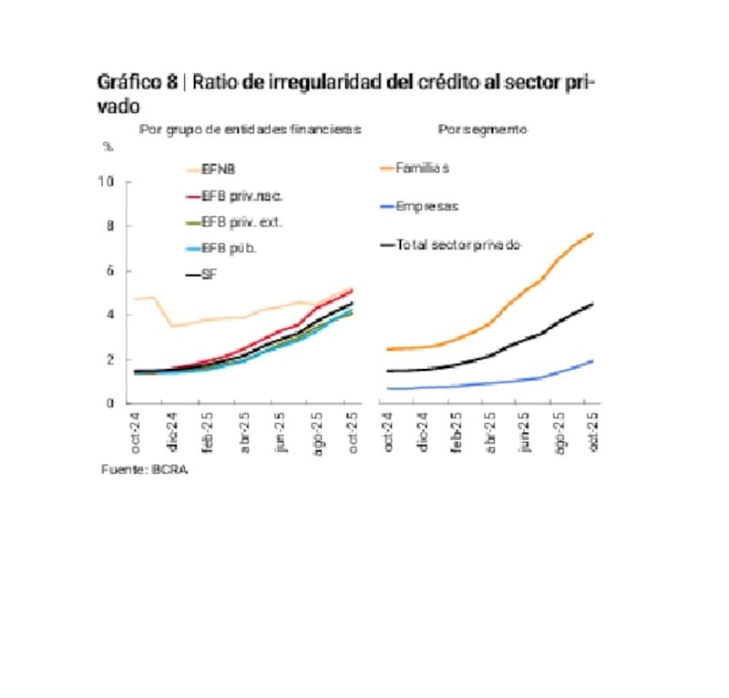 Las tasas altas, la interrupción del crédito y la caída del poder adquisitivo pegaron bajo la línea de flotación de los hogares. En octubre la irregularidad del crédito al sector privado volvió a aumentar y se ubicó en 4,5% a nivel sistémico. Pero el dato más preocupante fue la morosidad de las familias, que trepó hasta el 7,8%, 0,6 puntos porcentuales más que en septiembre.