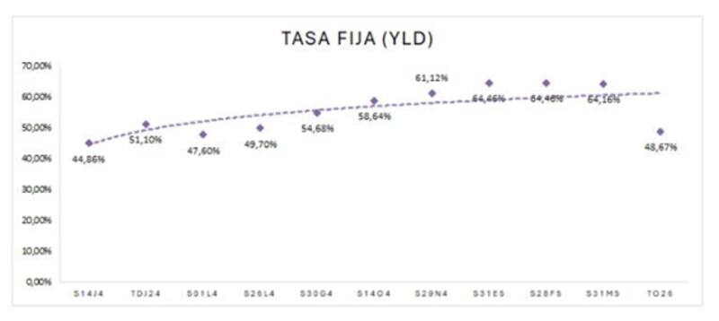 Las Lecap operan con tasas que van desde el 44% (TNA) en el tramo corto, saltando a rendimientos de entre 47% (TNA) y 58% (TNA) en el tramo medio y de entre 61% (TNA)a 64% (TNA) en el extremo más largo.