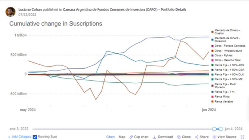 Tomando los flujos dentro de la industria de fondos comunes de inversión en el último mes se ven una avalancha de pesos a los fondos T+1, con suscripciones por $964.140 millones, según datos de AphaCast, en base a la Cámara Argentina de Fondos Comunes de Inversión.