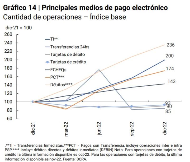 La autoridad monetaria estimó además que durante el último trimestre de 2022 las transferencias inmediatas representaron el 48,5% del PBI, lo que significó un aumento de 7 puntos porcentuales en comparación con el mismo período del año anterior.