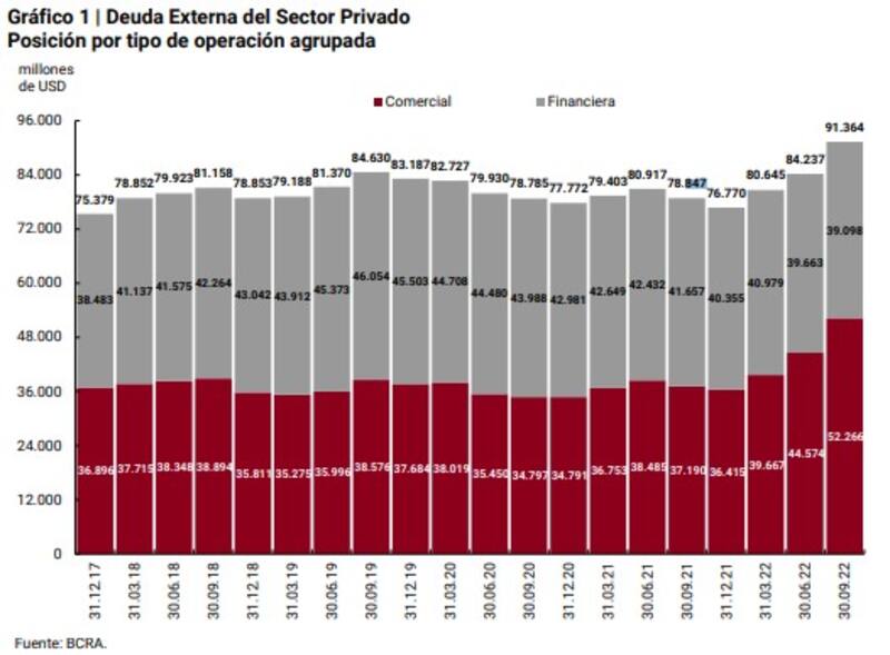 En ese sentido, la autoridad monetaria detalló que a finales de septiembre pasado la deuda externa comercial del sector privado totalizó u$s 52.266 millones, lo que representa un alza de u$s 7.692 millones en comparación con el trimestre previo y de u$s 15.076 millones respecto al mismo período del año anterior.