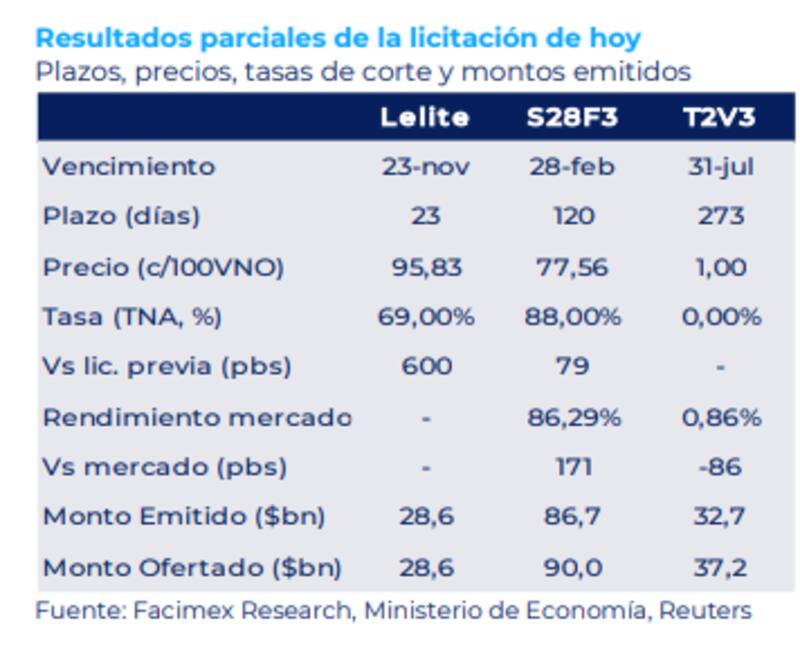 "Visto de manera conjunta con la licitación pasada, el resultado de ayer abre un interrogante de cara al último bimestre teniendo en cuenta que los vencimientos de noviembre y diciembre serán considerablemente mayores a los de los últimos meses, limitando la obtención de financiamiento", advirtió.